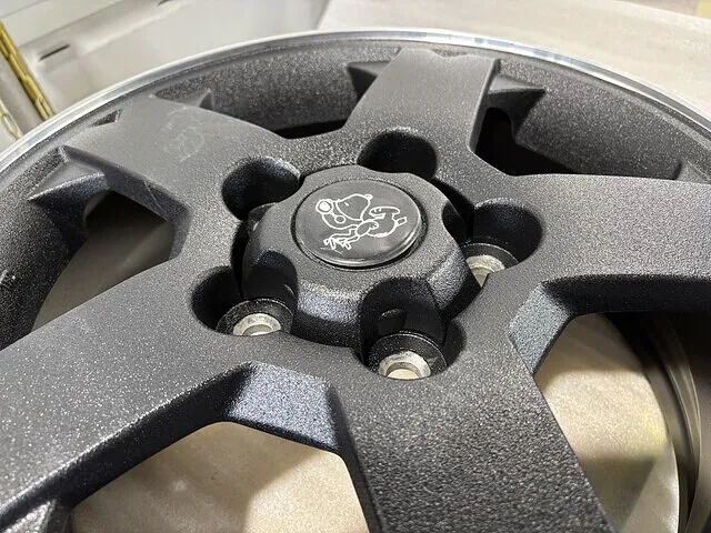今回のラプター塗装は表側のみ施工し、裏側は通常塗料のブラックに塗装しました。お客様のご希望でホイールの縁は塗装せずメッキの部分を残してほしいとのことでしたので、しっかりと養生して塗り分けしました!センターキャップもエンブレム部分は塗装せずに残しました!
